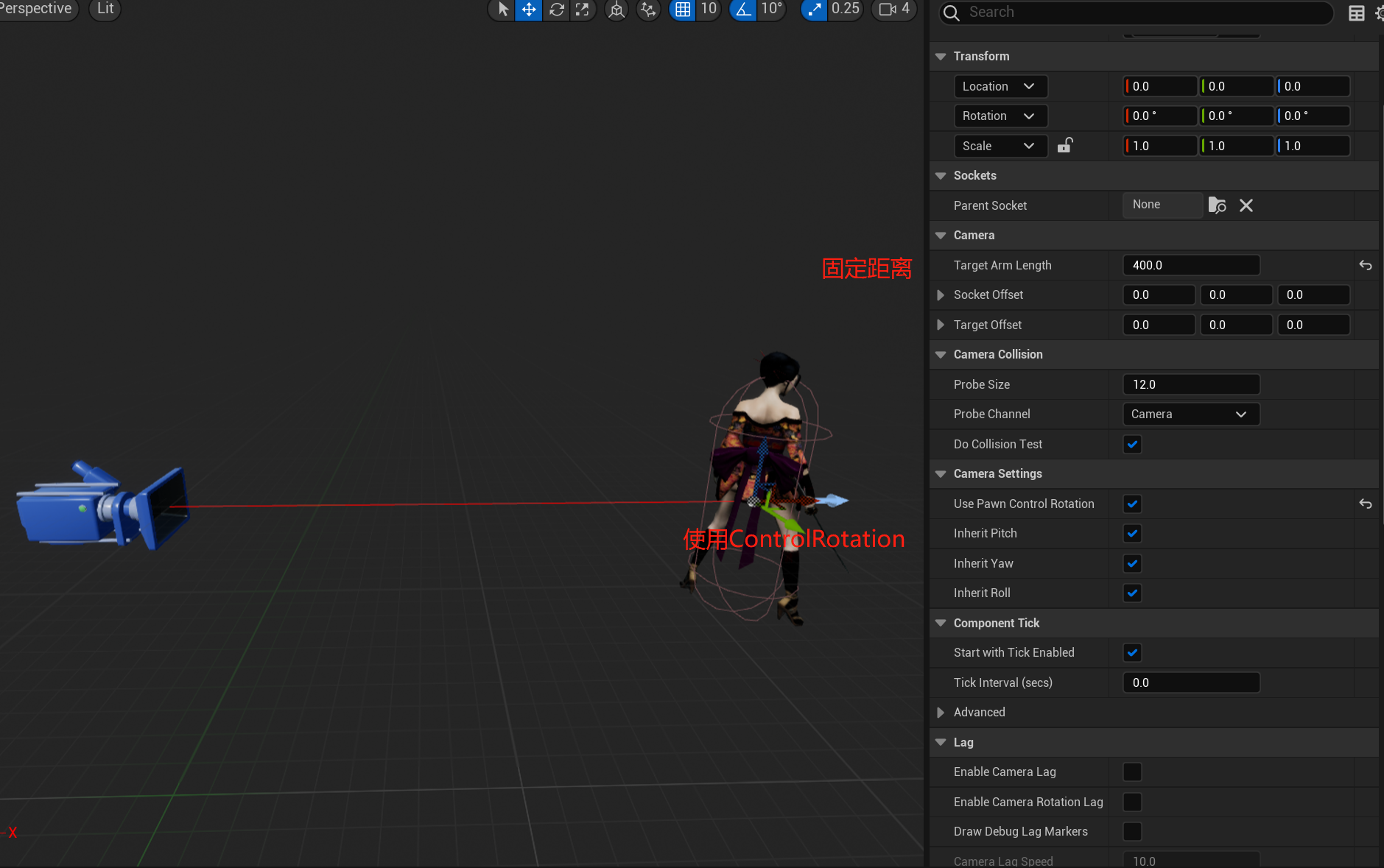 相机的位置 = 父节点位置 - ControlRotation * 弹簧臂长